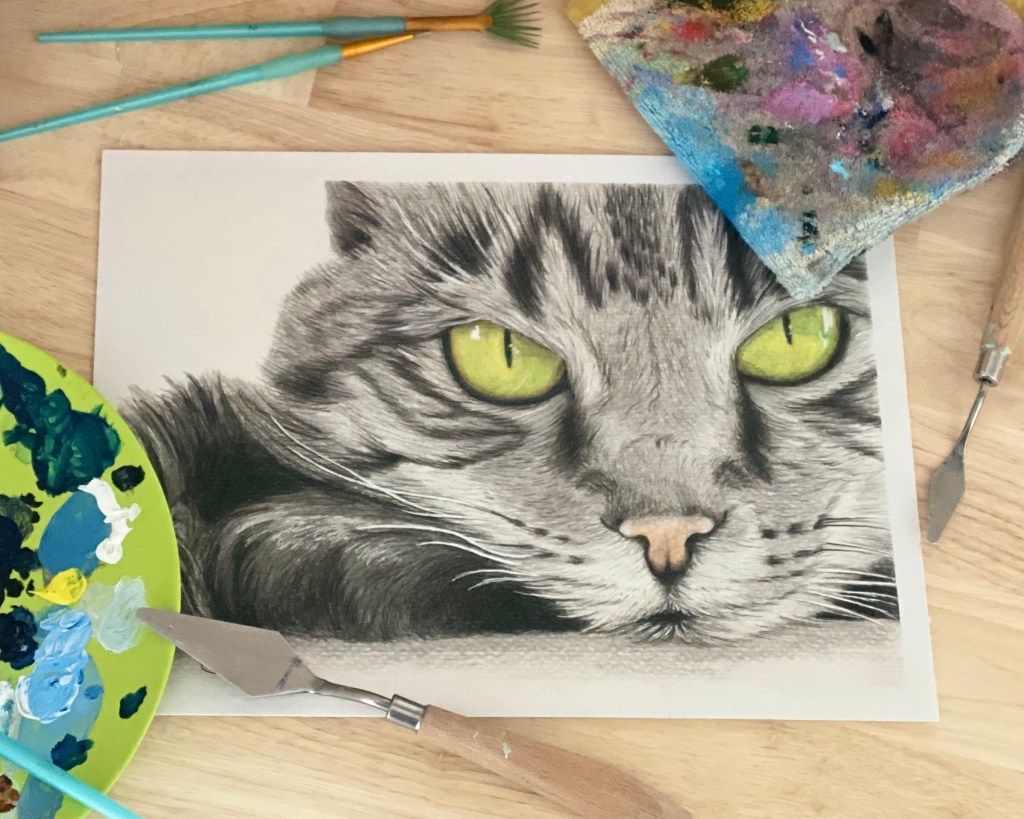 I have been creating artworks for clients for over 15 years now, and have experience in mediums such as graphite, water-colour, coloured pencil, and acrylics. My earlier artworks were primarily in graphite and were actually focused on people. Slowly I started to branch out and create works of landscapes and animals. Upon experimenting with coloured pencils and drawing a tabby cat with green eyes that stared into my soul, I realised that pet portraiture was calling my name! Then I dabbled in acrylics and here we are today – painting pet portraits.