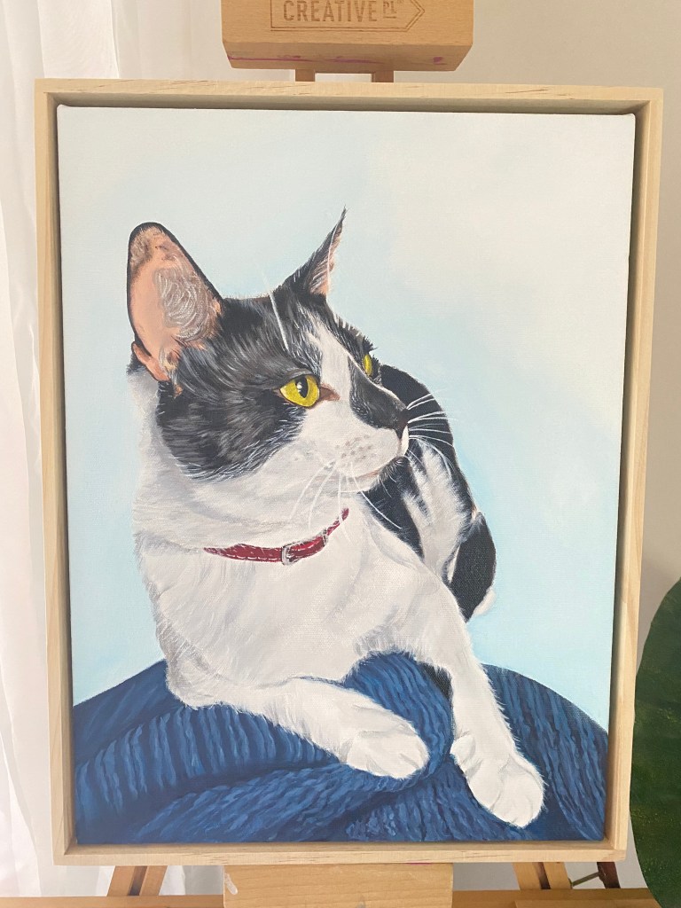 I feel my art journey now is really all about putting my skills to good use, to bring joy to others, and specifically to honour our pets. This brings me to the why; why did I choose to paint pets for others? Well, our family cat passed away. Now he wasn’t just any cat – he was the smartest, cheekiest, most loving boy a family could ask for. There was nothing I could do to save him, and believe me, I tried! The vet tried! We all tried so hard, but unfortunately it was his time to say goodbye. Coming home without him was miserable, and no longer seeing him everyday felt even worse! So I painted him. We found it helped, a little. We could look at his handsome face everyday and remember a time when he was happy and healthy. This became my ‘why’.